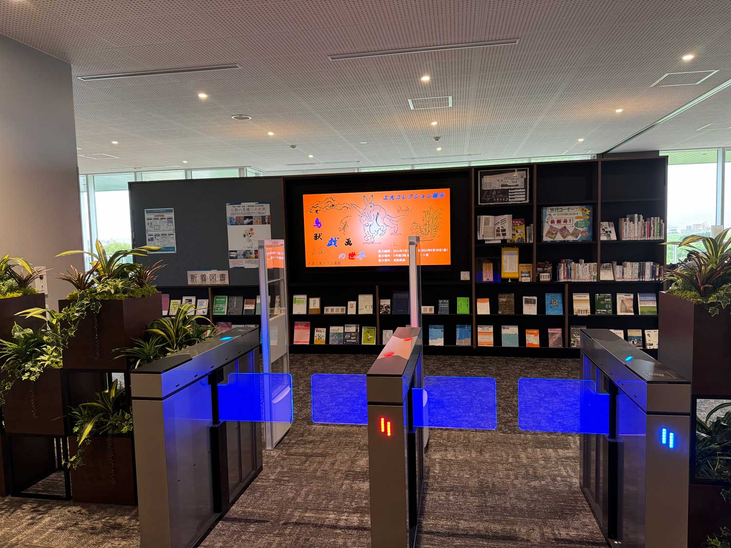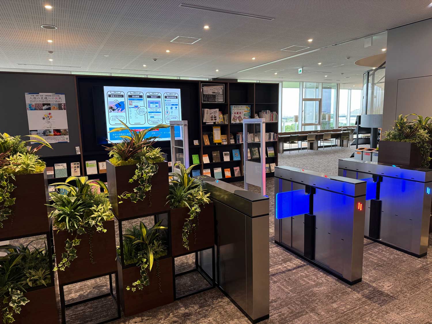 図書の貸出しや返却手続きが便利にできるように、4階から6階までの各フロアにBibliotheca社製のUHF対応の自動貸出返却機を設置しています。複数の図書を瞬時に読み取り、画面に出てきたリストを確認してタップするだけで簡単に貸出しも返却もできるため、現在では貸出の大半は自動貸出機が利用され、カウンター業務の軽減に役立っています。貸出だけならスマホアプリを利用した手続き方法も導入しました。退館の際はBibliotheca社製のBDS装置が未手続の図書があれば感知して、カウンタースタッフに知らせるとともに本を特定することもできます。